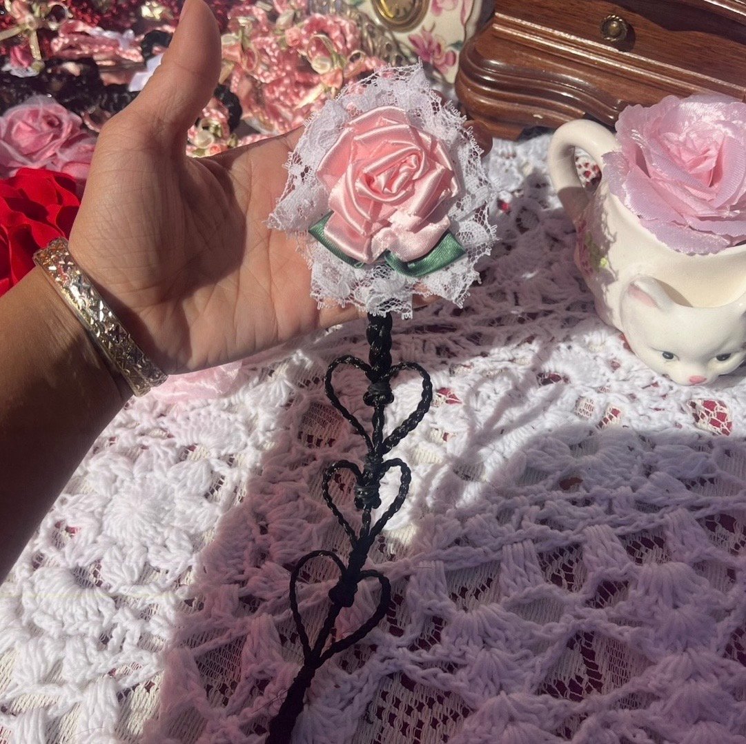 Pink satin rosette with vintage lace